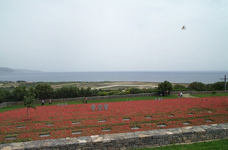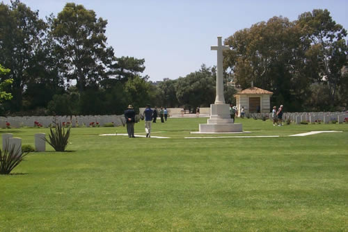 This picture was taken in the main German cemetery on Crete. Looking out to sea an over the Maleme airfield which was defended by the New Zealanders. This airfield was the focus of the German attack and was the scene of fierce fighting. The German cemetery is not allowed to have headstones standing and there are two men in each plot. The German’s are still not so welcome on Crete.