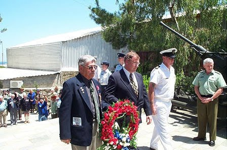Wayne Mapp, MP (now Minister of Defence), and New Zealand Crete veteran, Sonny Sewell, lay a wreath at the Australian