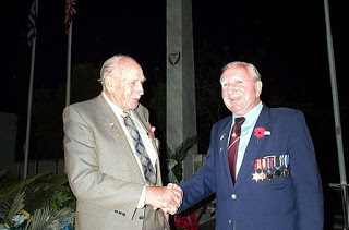 Captain George Brown of Nelson. A good friend of mine who died several years ago. When I visited Crete George was there for the first time since he was wounded, left behind and became a prisoner of war. He was shot in the knee by a sniper and had his leg amputated by a German military doctor. George was the Second in Command of the company which included Charles Upham. It was Charles Upham and a number of other soldiers that ripped a door off a house and carried George in to medical help when he was wounded. This picture was taken at the Galatas memorial for New Zealanders on Crete.