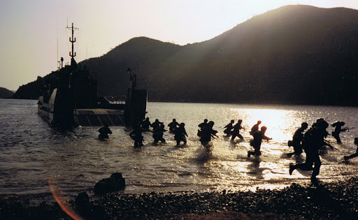 Beach assault landing Hong Kong/China border. B Company comes ashore.